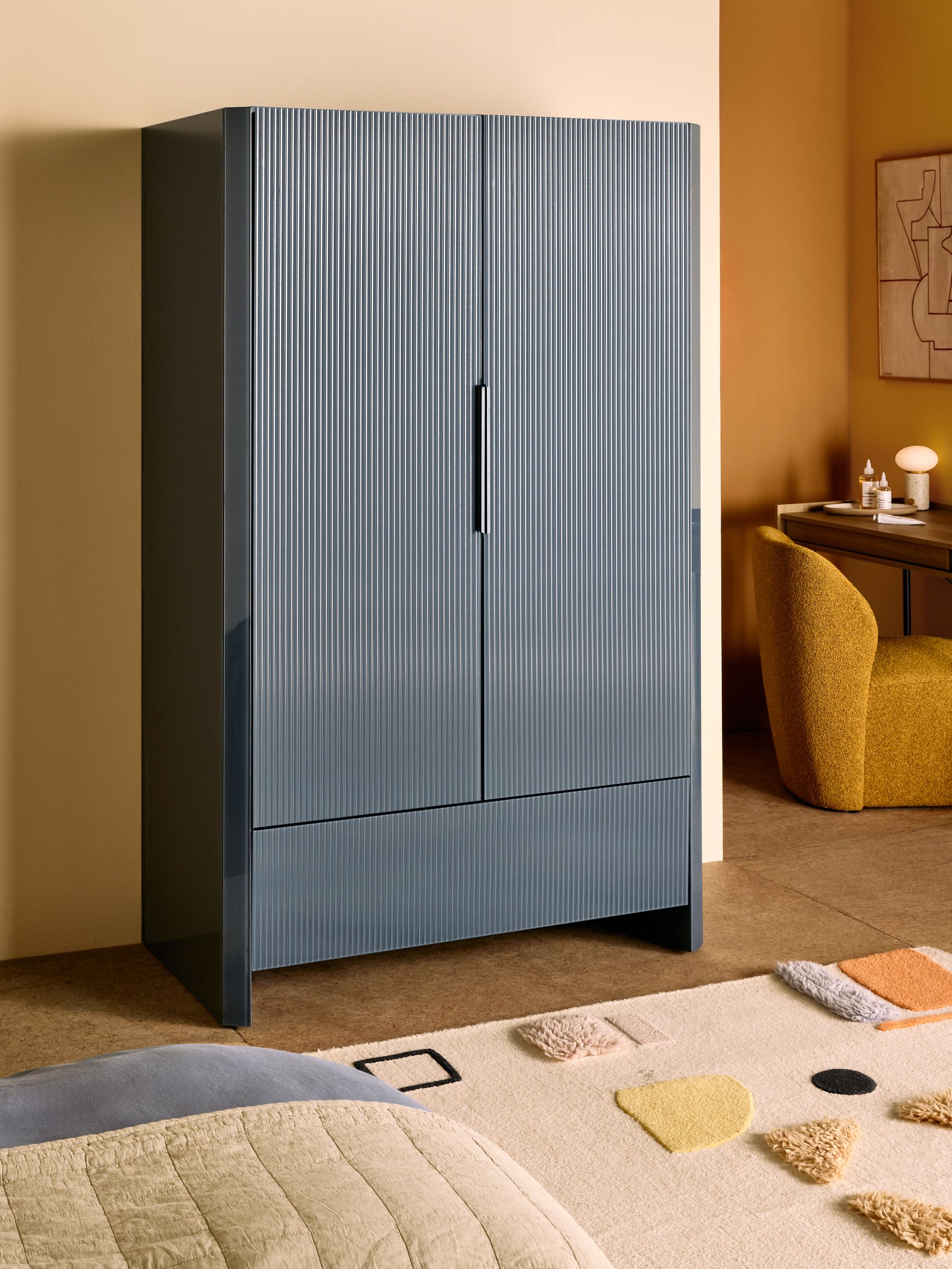 Elegant, refined, on-trend - Eleni is a triple threat. Designed with ribbed glass detail on the front, this spacious wardrobe comes with a hanging rail and bottom drawer. This is glass furniture that makes you look. Hanging rail Storage drawer Glass furniture Ribbed glass detail Height 180cm Width 110cm Depth 60cm Wipe clean only. Multibuy: Save 10% when buying 2 or more items each priced at £150 or above across selected Sofas, Chairs, Rugs, Beds, Mattresses and Furniture Collections. Multibuy is only applicable to the UK Mainland Area.* Condition: * Saving applied will be apportioned across all qualifying items. To get the saving, you must order the qualifying items in the same order at the same time. If you later return one of the items, you will not be entitled to the discount. Offer applies to selected items at full price. Please refer to T&Cs for full details. This product requires self-assembly. Regrettably, self-assembly items cannot be returned once assembly is part or fully completed, unless they do not comply with the description given, are faulty, or are not fit for any stated purpose. Your statutory rights are not affected., Larger products with this symbol will be delivered by Next Home Two Person Delivery, who will place the product in the room of your choice. Assembled furniture will be unwrapped. Cost for 2 man delivery, £15.00. If you order more than one, item we will only charge one fee. We deliver seven days a week except for bank holidays., We want you to love our furniture. So this piece comes with a 15 year guarantee that you can trust. Our 15 year Structural Guarantee covers your furniture against manufacturing faults or defects of the frame construction from the date of delivery. Exclusions apply, for more details see https://xcdn.next.co.uk/pdfs/buyingguide/15yrguarantee.pdf