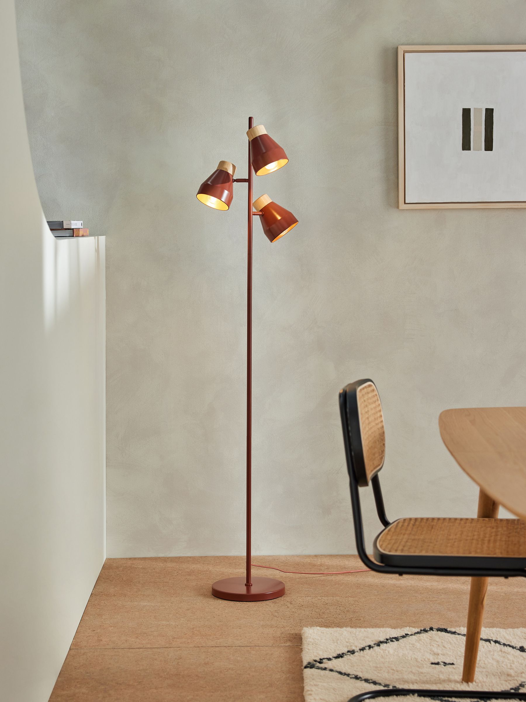 Create a clean, pared-back look with this Scandi-inspired floor light. With a powder-coated metal frame and wooden caps, the three narrow shades are poised to create focused pools of light. Product Dimensions: Height (cm) 162 Width (cm) 37 Depth (cm) 37 Weight (kg) 5 Product Details: Assembly Required (Yes/No): Yes Number of Bulbs required: 3 Bulb Cap Type + shape: E14 Golf Bulb Max Bulb Wattage: 7W Bulb(s) Included: No Cable Length (cm): 200 Cable colour: Red Switch and plug colour: White Dimmable (Yes/No): No Care instructions: Wipe clean with a soft dry cloth only. Ensure the light is unplugged or switched off, and allowed to cool before cleaning. Height 162cm Diameter 36cm Click here for information on how to recycle your old electrical item. For Ireland: If this product contains an LED light bulb or luminaire, included in this price is a contribution to recycling costs of €0.05